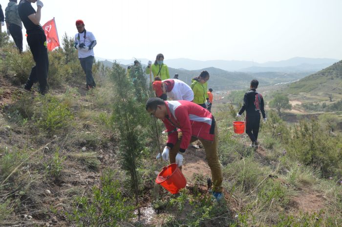 植樹活動現場,來自公司機關、橋靠分公司、三合村分公司、金橋分公司、辛家營分公司的32名青年志愿者和其他直屬團委的志愿者們參加了此次活動的啟動儀式。隨著團市委書記成紅亮同志宣布活動啟動,公司青年志愿者們在團委副書記郭振宇的統一帶領下,有序的加入到植樹活動的行列中,個個熱情洋溢、干勁十足,有的運樹苗,有的揮鍬,有的扶樹,有的培土,還精心地把土踩實,并為它們澆灌生命之水。各個環節銜接有序,樣樣做得認真到位,個個忙得滿頭大汗,到處都是忙碌的身影和勞動的歡聲笑語。經過大家一上午的共同努力,種下了28株充滿生機和希望的樹苗。