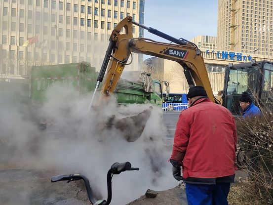城發(fā)供熱公司總經(jīng)理朱大偉,副經(jīng)理阮強、丁成斌、橋靠分公司副經(jīng)理陳龍、張國梁以及相關(guān)技術(shù)人員及時趕赴現(xiàn)場,根據(jù)漏點發(fā)展情況,在確認管網(wǎng)位置及敷設(shè)情況后,及時啟動應(yīng)急預(yù)案,立即組織對漏點部位進行破土挖掘。機械挖掘近三個小時后,由于地溝上方有弱電通信光纜且坑內(nèi)霧氣太大,無法繼續(xù),開始采用人工挖掘,經(jīng)過近七個小時的人工挖掘后,最終鎖定漏點在近半米長的主管道上,有多個裂口同時噴射。