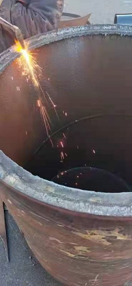 在場人員研究制定了搶修方案,決定不更換管道,而采用"包裹式"的方式進行修復(fù)--在原DN700的老舊管道上包裹DN800的管套封堵漏點,將DN800的管道切割成兩部分,分別安裝,與水泥管道接近的部分打磨成壁度在4公分以內(nèi)的管壁,焊接后進行管道碰口。當(dāng)時,室外溫度已降至-15℃,地溝內(nèi)溫度高,地面溫度低,施工難度大。為保證快速、高效、安全完成新管套接,搶修人員只能手提工具沿著管道貓著腰爬到連接處,窩在管道下方,在管套與管網(wǎng)連接處焊接。
