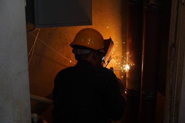 上午9:30時,直播組來到開天花園北區1號樓前,小區供熱主線的管溝內,一工人師傅穿著長褂,帶著手套在狹小的空間內正嫻熟地進行焊接,飛濺的火花下面,看不清楚他的臉,待焊接完一段后,他取下電焊面罩,露出一張黑紅黑紅的臉,汗水順著額頭直瀉而下,汗珠吧嗒吧嗒流在眼里、滴到了地上,不時用衣袖擦眼睛。他告訴筆者,地面溫度是36°,他焊接的周邊溫度要達到50多度。面對高溫的"烤"驗,他全然不顧,用他的話說:這是他們的工作常態,早已習慣。