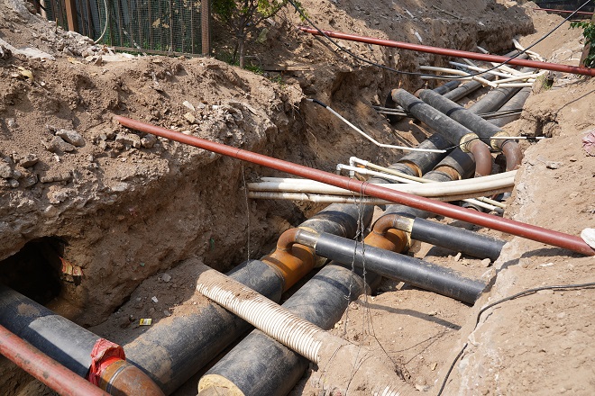 在開天花園小區熱力站供熱管線出口區域,兩名工人師傅正在清理現場的供熱管線。現場看到管溝內鋪設的主管線、與樓宇的抽頭安裝已全部完工,溝內自來水管線、污水管線、弱電管線、強電管線縱橫交錯。