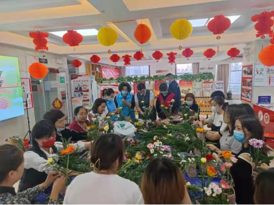 活動現(xiàn)場,來自企業(yè)、社區(qū)的各族職工、居民興致勃勃地與花藝師交流互動,請教一些插花方面的專業(yè)知識,并在老師的講解示范下,創(chuàng)作自己的作品。一枝一葉通過他們的精心構(gòu)思化作了一個個造型優(yōu)美、寓意豐富、活靈活現(xiàn)的濃縮景觀,寄托著他們對幸福生活的由衷贊美;一花一蕊通過他們的精巧點(diǎn)綴變成了姹紫嫣紅、香氣撲鼻、爭奇斗艷的立體畫廊,放飛著他們對多彩人生的憧憬遐想。大家捧著自己的作品愛不釋手,觀賞著同伴的成果互相切磋,現(xiàn)場洋溢著花香和歡笑。