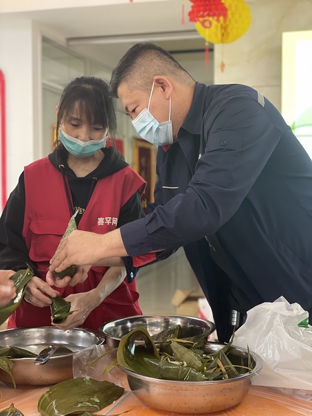 包粽子活動中,大家捋粽葉、填糯米、壓實(shí)、封口、打捆……熱情高漲,精工細(xì)作、巧手翻飛、各顯其能,既分工又合作,一邊交流著包粽子的技巧,一邊嘮上幾句家常,沉浸在歡樂和諧的氣氛中。三角形、牛角形……隨著各環(huán)節(jié)的制作完成,一個個粽子紛紛成型,各式各樣的漂亮粽子出鍋了,空氣中散發(fā)著清爽甘醇的氣息,既讓大家感受到傳統(tǒng)節(jié)日中蘊(yùn)涵的意義,增強(qiáng)了愛國主義情懷,又加深了社區(qū)居民、企業(yè)員工之間的友誼感情,營造了“一家親”的濃厚氛圍。